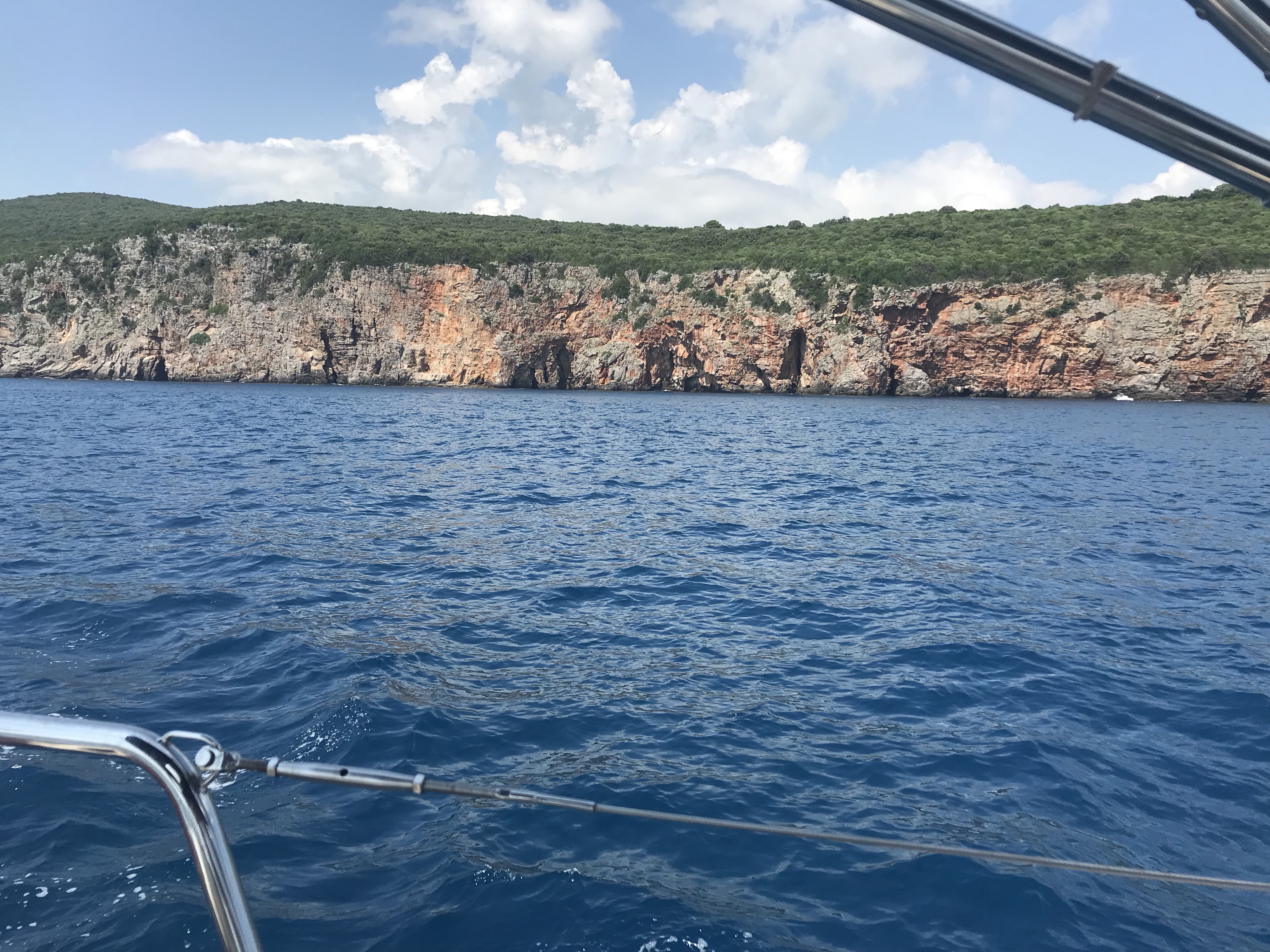 Our next port of call is Budva and although we should be racing the wind has dropped to 2 knots on the nose. Not much to move a 50ft floating caravan. The unanimous decision is to motor along the coast high mountains descending into the sea with rocky bays hiding numerous pirate caves. I can visualise Odysseus sailing along this coast being pelleted by rocks thrown by giant cyclops.
