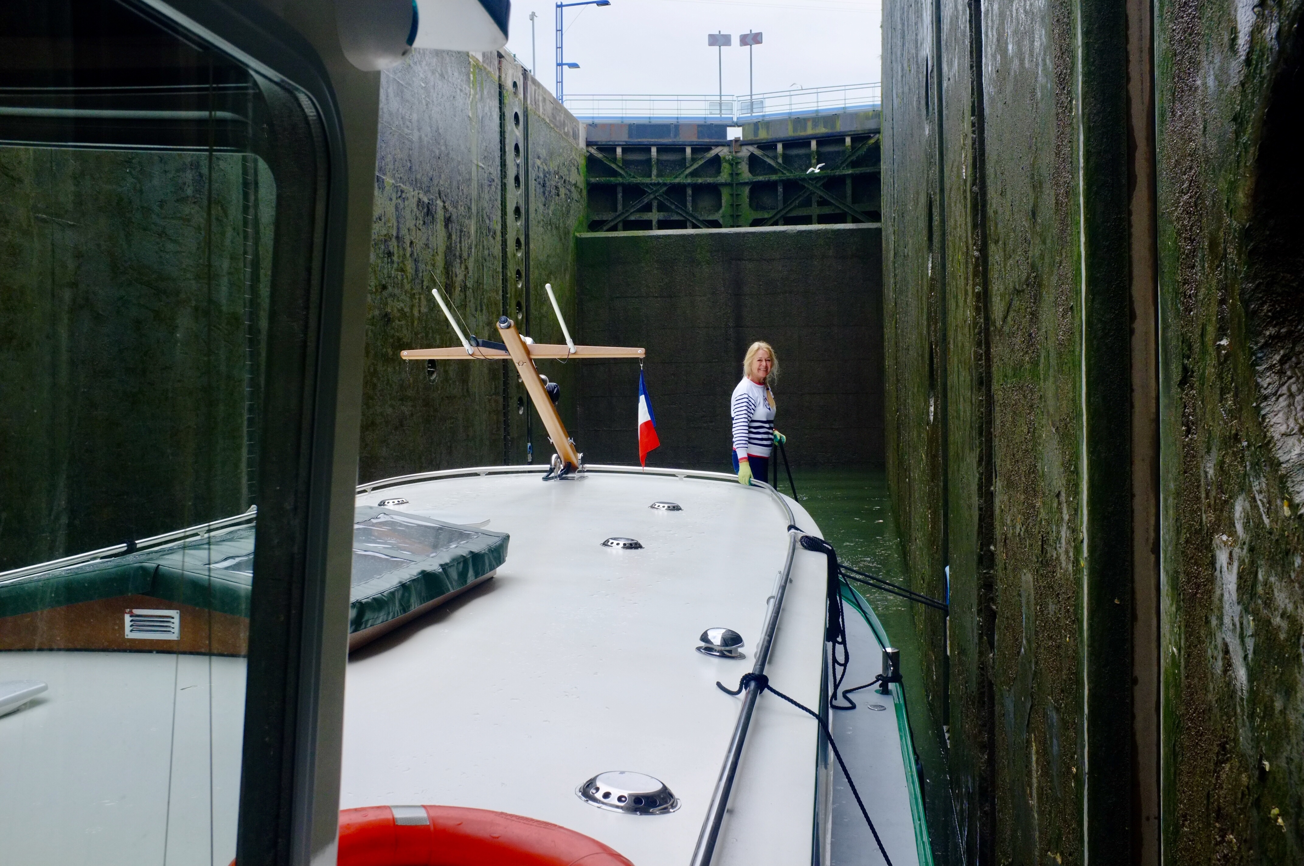 Once we were through the sea lock, we entered a small basin and then into the next lock, which was smaller than some of the locks on the Thames. With a stiff breeze it was quite a difficult manoeuvre to enter! This lock was deathly slow and we didn’t exit until nearly 5.00pm. Finally another lock this time with a locker keeper, who interrogated us on our proposed navigation. Peter had spent time making sure all our papers were in order, but once we handed over our Australian ship registration documents it all became too hard and he waved us through.