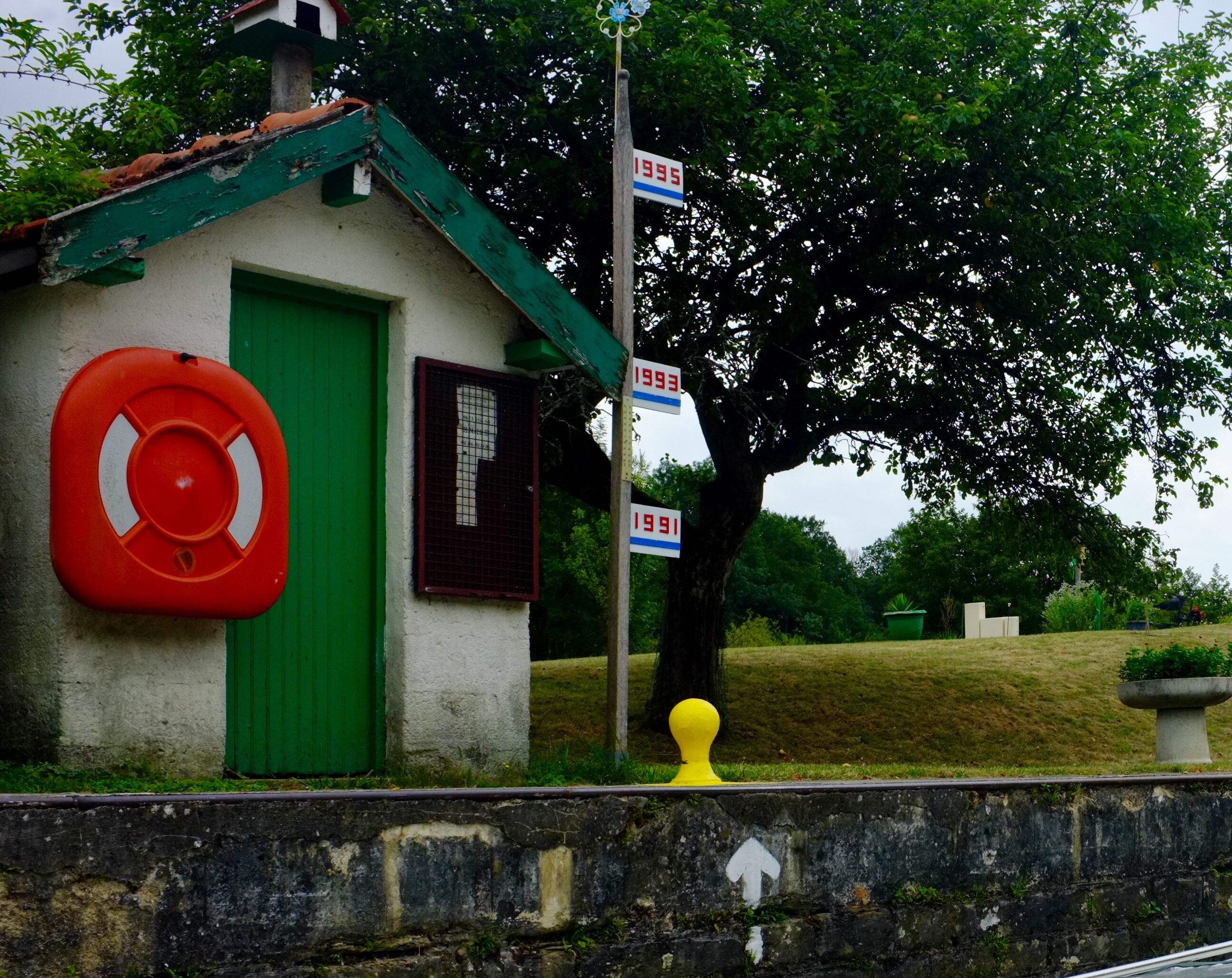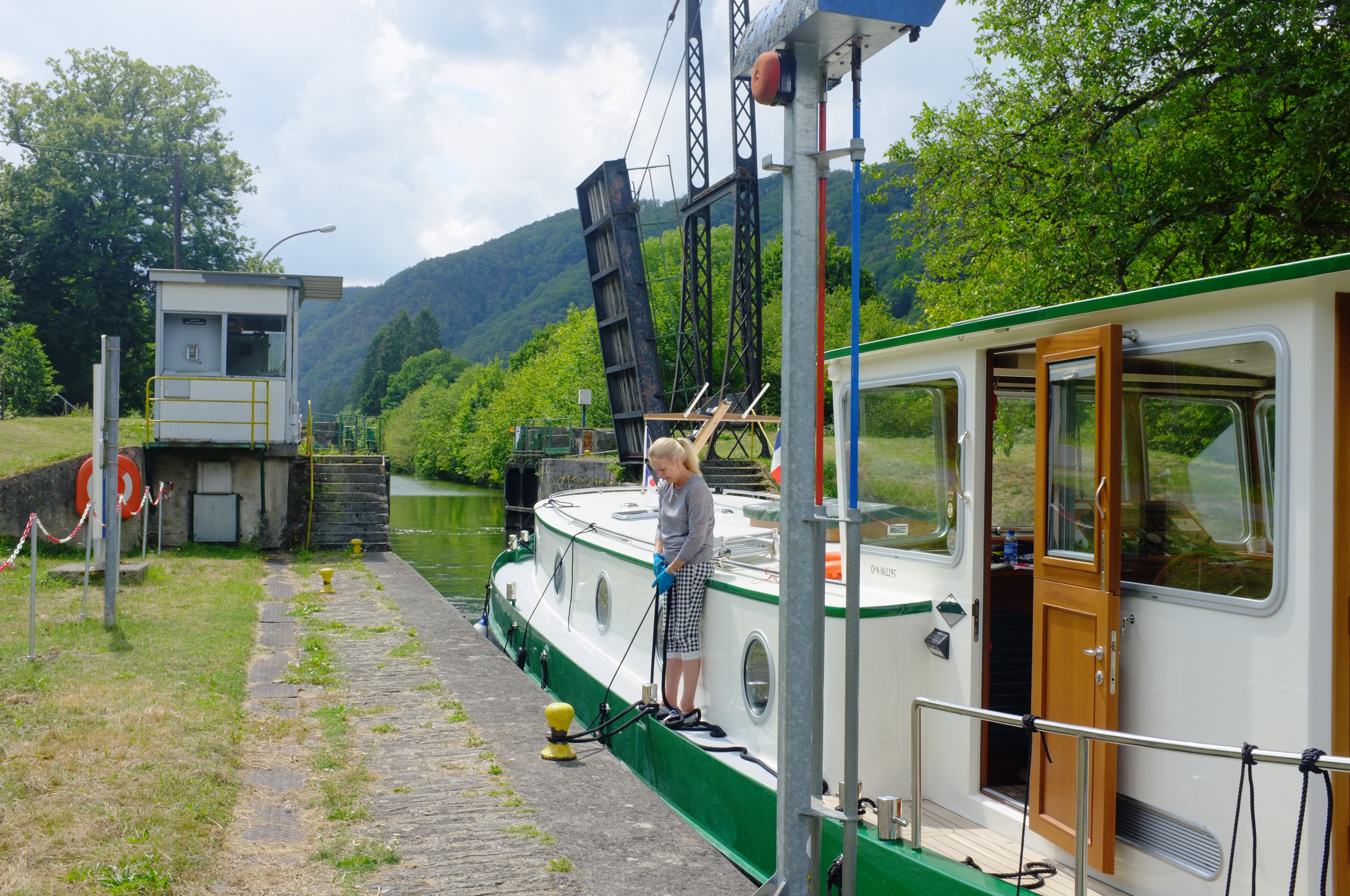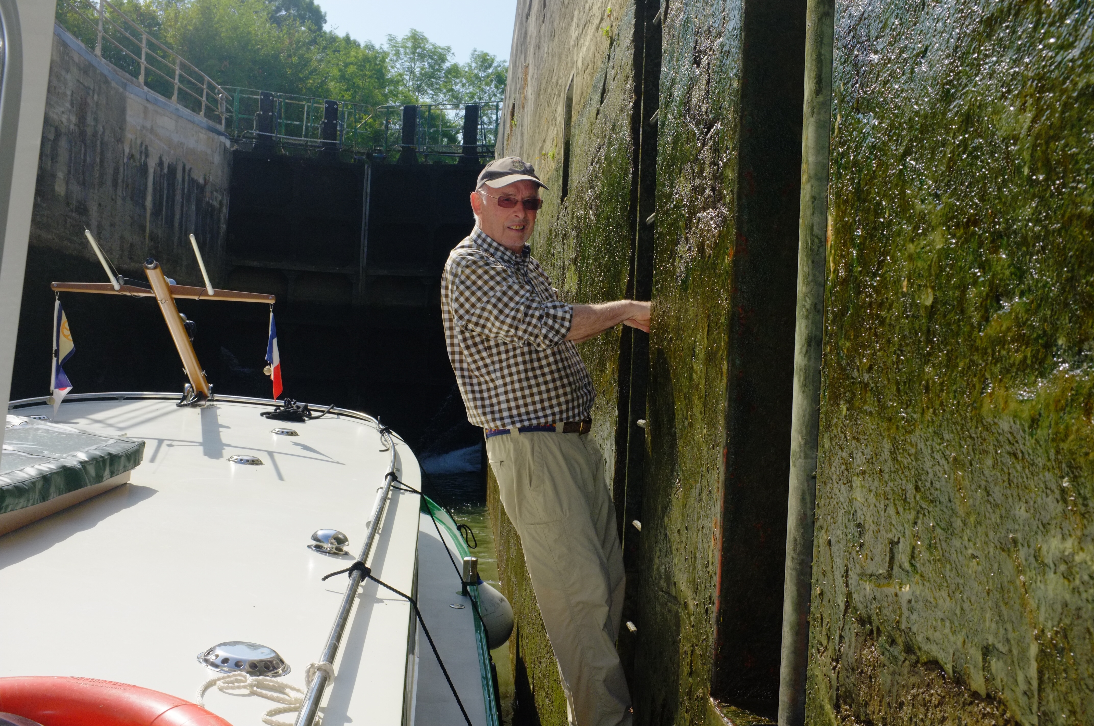 Our guide fluvial (waterways guide) indicated there was a customs stop at Pont de Heer where we crossed the border into France, and although we kept a sharp eye out, there was no such stop, so with only a change of curtesy flag, we breezed along the river and into France. At the next lock we collected our remote control to operate the automatic locks, which were the feature of the next part of our journey. This control looks rather like the old fashioned garage door openers, and to operate it you point it at a box before the lock and voila, like magic the lock gates open to admit you. Once inside the lock it is only a matter of pulling a pole for the gates close, the water fills (or empties as the case maybe) and in about 10 minutes, you are on your way. Well, that’s the theory, and it does work most of the time, but when it doesn’t either the skipper or the crew needs to climb a ladder and contact the eculsier via an intercom, who jumps in a car and comes rushing to rectify the situation. Our first non operational lock was over 3 meters deep, so Peter kindly offered to make the climb!