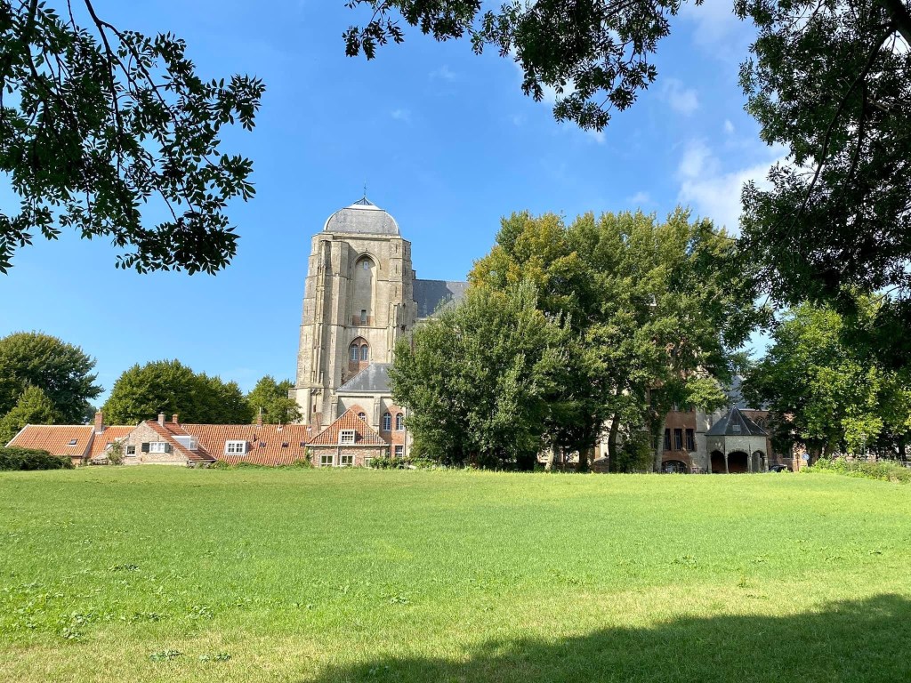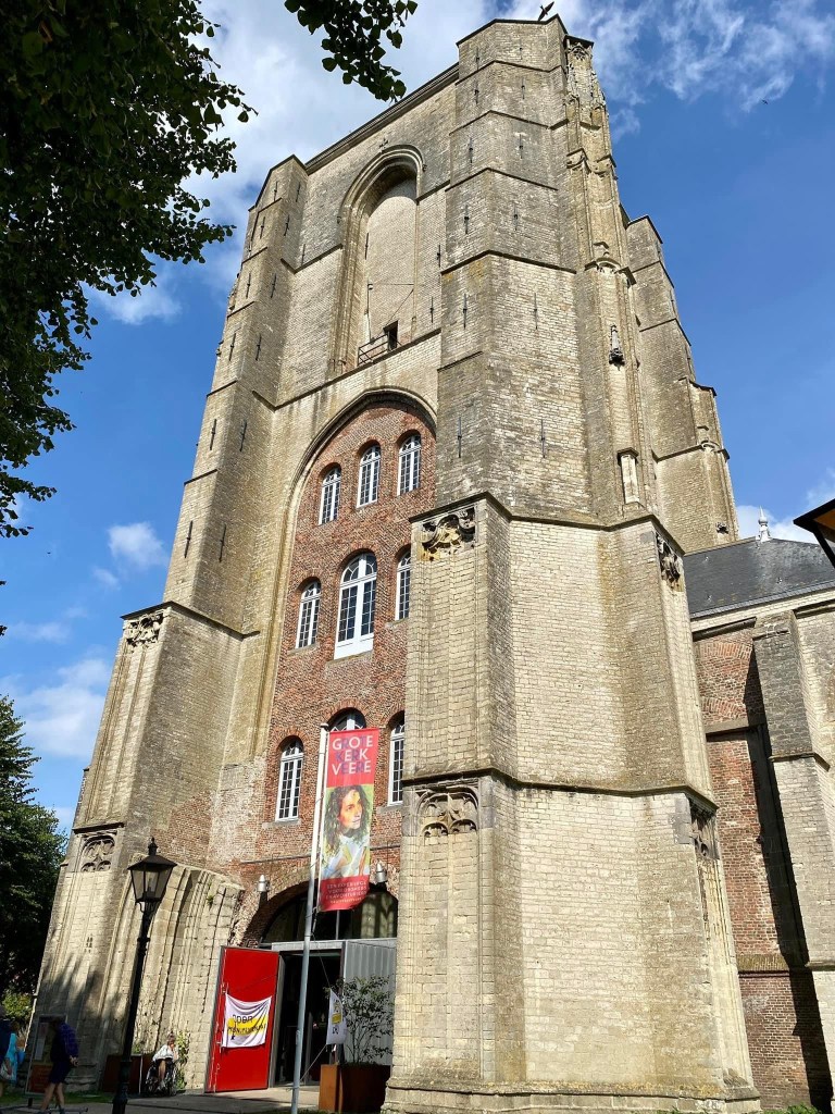A view of the Grote Kirk. This unfinished church has a chequered past.The tower was meant to be 100 meters high but never reached this dizzy expectation. This explains its rather squat look. During the napoleonic wars it was utilised as a hospital and military barracks and during floods was an emergency stables for cattle. Today it is a cultural venue and tells an exciting visual story of the town.