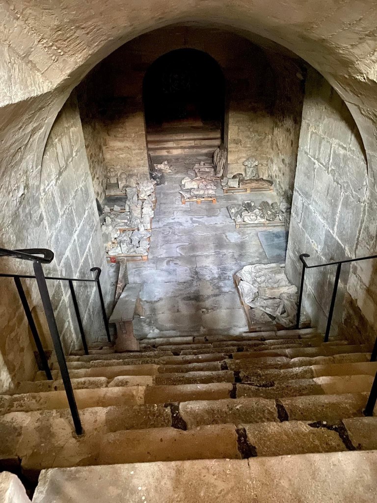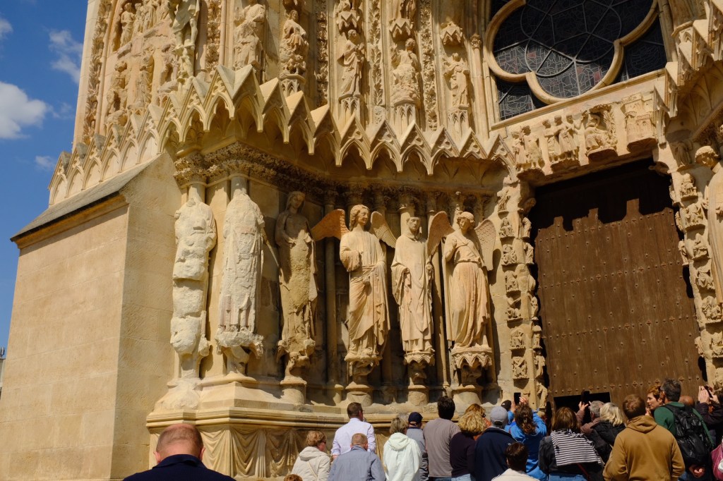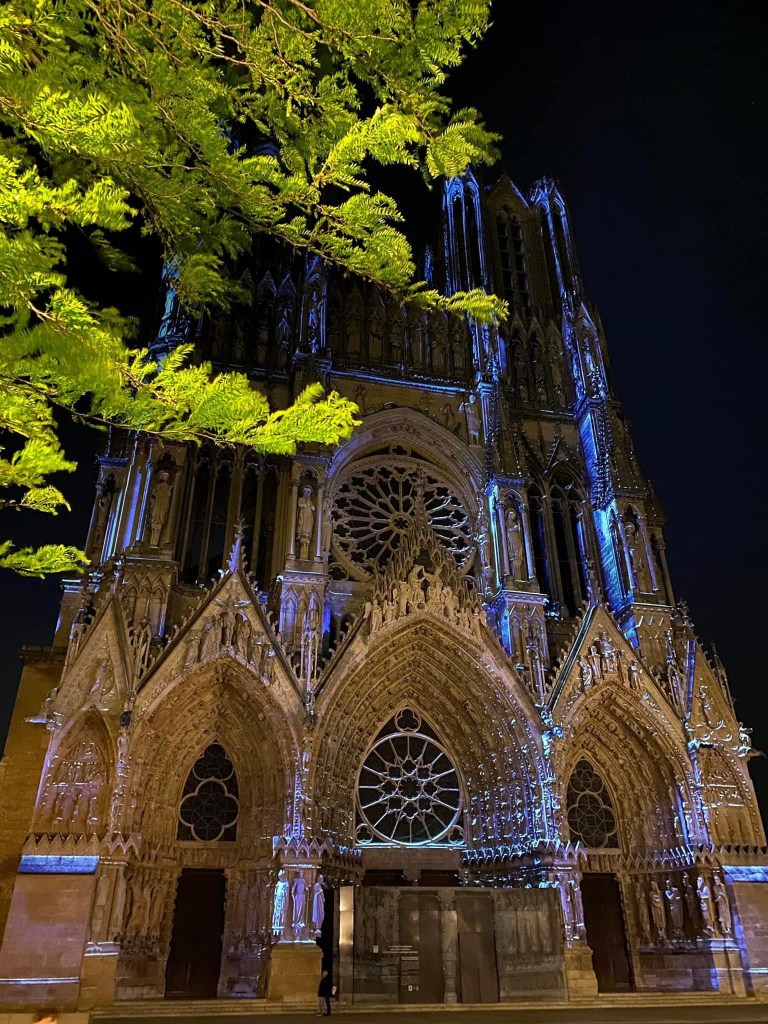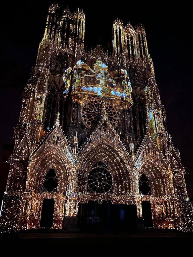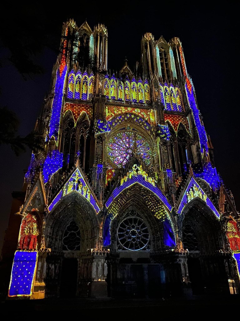 The cathedral at Reims. The last French king to be crowned there was CharlesX in 1835. The light and sound show on the facade of the cathedralThe cathedral was severely damaged by bombing during WW1 and the images of the damage was used by the French to confirm the barbarity of the Germans. After the war many thought the cathedral should not be repaired , but rather remain a monument to the victims of war. This was luckily over ruled and the cathedral is now a permanent renovation site, correcting not only the ravages of war, but now the damage caused by pollution. Beginning in 1968 many of the statues on the exterior were moved to the adjacent Archbishops palace and replaced by copies. The statue on the left is the smiling angel. Don’t know why she is famous, but is is featured on a lot of promotional material for Reims