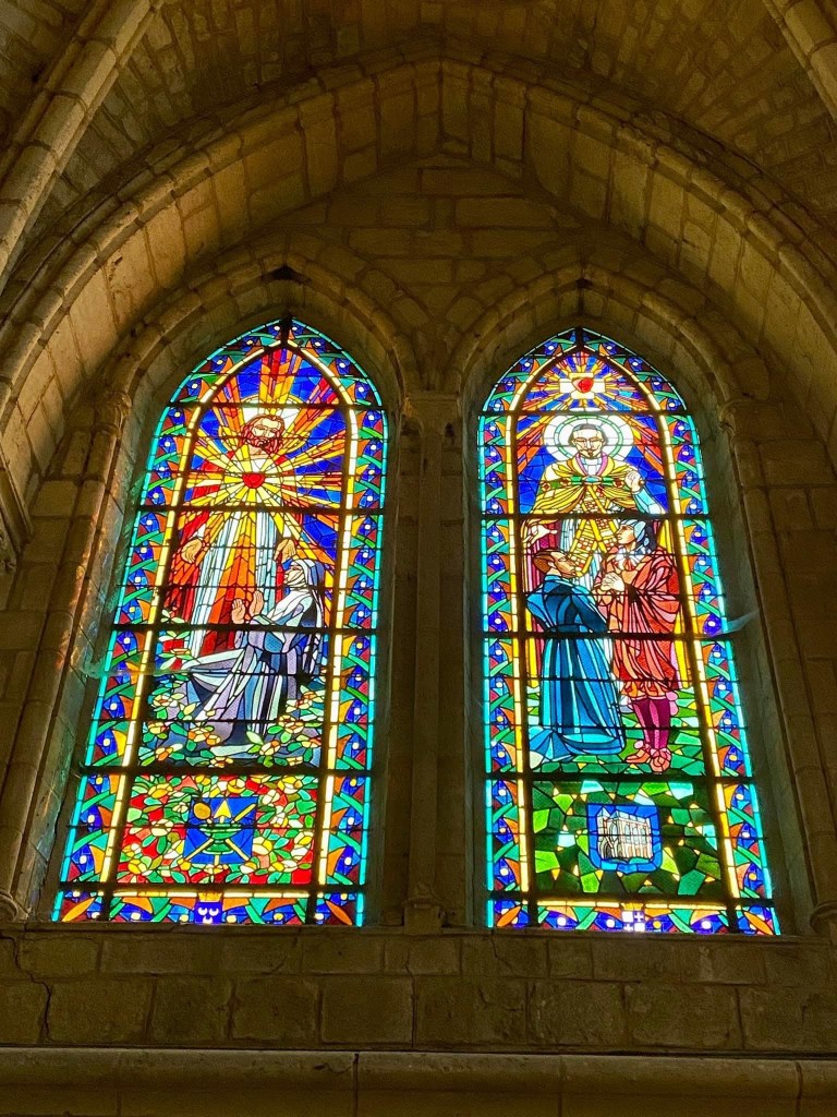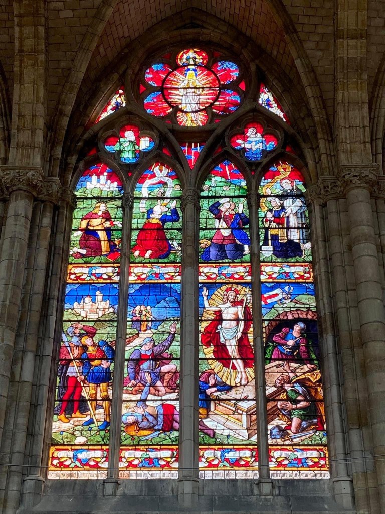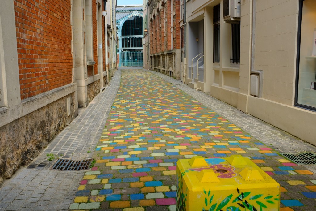 We made a slight detour and turned left up the canal to the city of Chalon en Champagne. Sorry, only one champagne cave here. Oh dear, our stocks will be running low!Pavement art in Chalon de Champagne The saint Etiennes cathedral The cathedral is noted for its 12th century stain glass windows and Romanesque cryptThe architecture has a definite alpine look. This is apparently due to a number of people migrating to Chalon en Champagne from the Alsace region after the Napoleonic warsMore pavement art and a Lego bridgeAnd at last the sun has chased away the rain clouds!