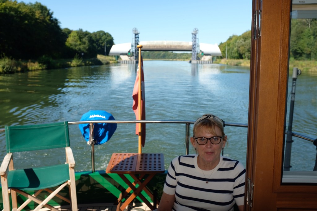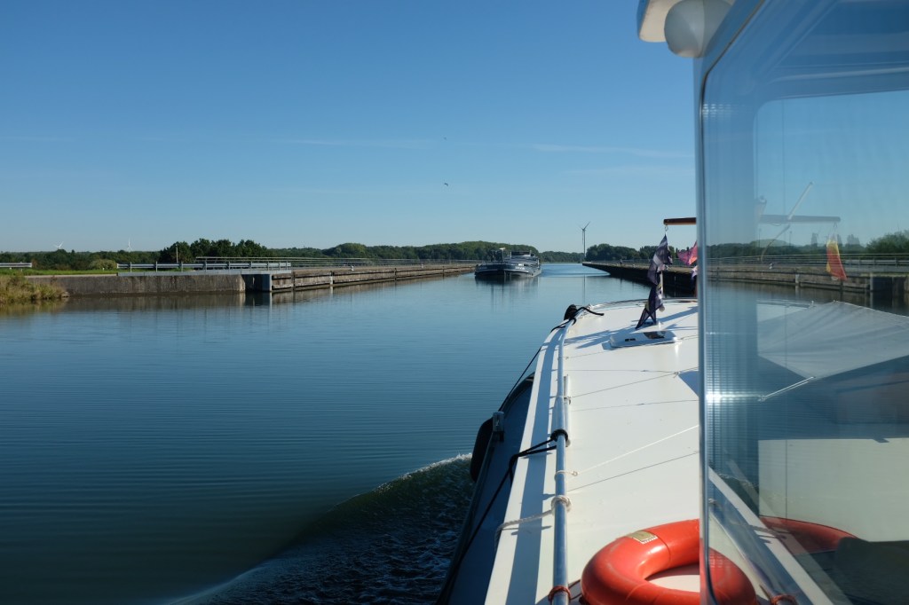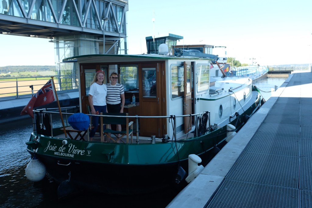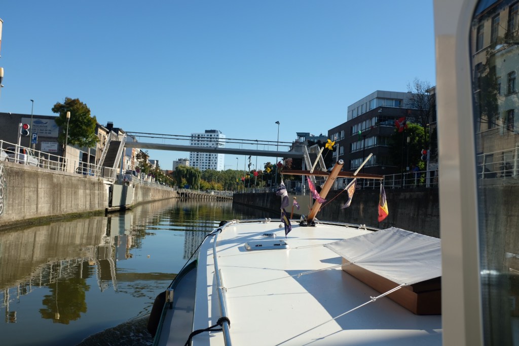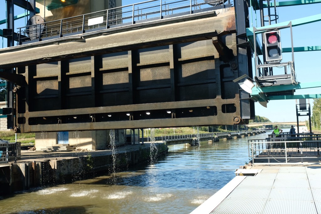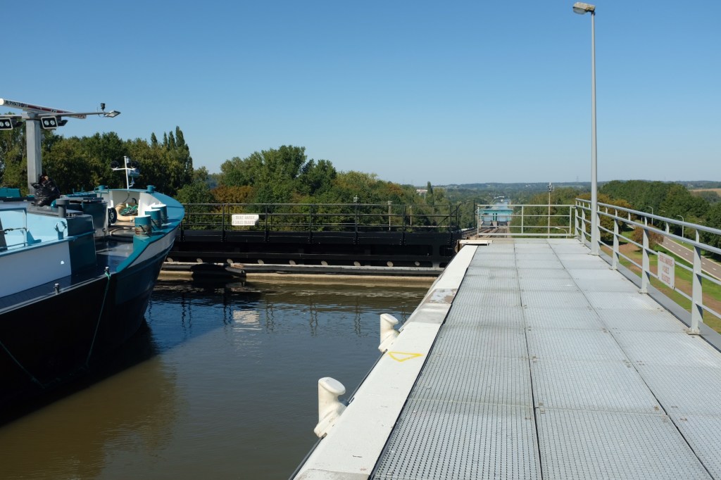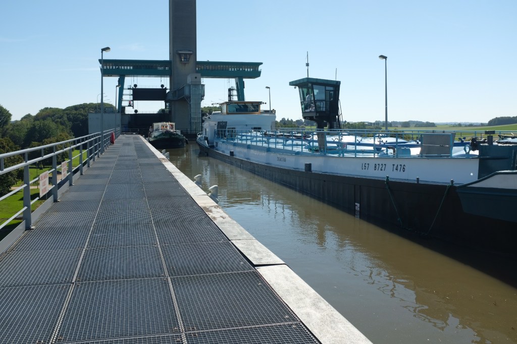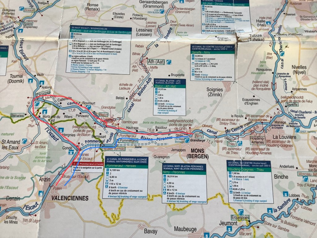 No longer in the land that holiday dreams are made of. Now on the commercial canal with deep locks and commercial trafficFrom Valenciennes we had the option of 2 routes to take to Mons on the canal du Centre. The red line indicated the route turning left at Conde to Peronne in Belgium then navigating to the Nimy canal to the Canal de Centre. A distance of 75.9kms. The blue line indicates the route turning right at Conde to the Pommeroeul canal then to the Canal du Centre, a distance of 44.9kms. The choice was obviously a no brainer, but the question was if the Pommeroeul canal was open. And I could find no clear answer to this question. Built in 1980 the canal silted up on the French side in 1990. The Belgiums have kept their end open but the French are still working on the dredging with no clear date when this will be finished. It was only when we reached the lock at Conde that we discovered the short route was not a viable option. Given that we average a speed of 9kms per hour, with 3 locks to navigate it was a very long, tiring day. Luckily there were 3 of us to share the driving.Now on the canal du Centre, we left Mons early with the Strepy Thieu boat lift and once we hit the Charleroi Brussels canal, the Ronquieres incline plane , ahead of us. Our destination of Brussels was still 70 kms away.The forth trip for Joie de Vivre but a first for Margaret, we entered the lift to be transported 73 metres up the side of the hill which disrupts the flow of the canal. I still remain in awe of this engineering feat.Now at the summit we would commence the trip down towards Brussels. The next obstacle on the canal was the Ronquieres Incline planeThe incline plane was opened in 1968 and was built to replace 14 locks on the Charleroi Brussels canal. It is 1,435 meters in length and has a vertical rise of 67 meters. It has two caissons each with a 5,200 ton counter weight, that runs in a trough between the rails. Over recent years, the Ronquieres has been continually plagued with breakdowns. In 2019 we were delayed in Brussels for 5 days while work was done to rectify such a breakdown. Yes, I did ring to check that the Ronquieres was open that morning, and was given a positive response. But when we arrived around lunchtime the lock keepers were working on a breakdown, which we were told would be rectified within a few hours. Luckily there were only 2 smaller commercials waiting to go through, so I could organise to accompany one of them.On the move at last, we chugged down the hill at 1.2 meters per second, the whole journey taking about 20 minutes. With this delay we realised we would not make it to Brussels that day, so we stopped at the town of Halle for the night.The canal runs through Brussels and there are about 8 lifting bridges, but the comparison to the trip through Paris on the Seine to the trip through Brussels by boat is chalk and cheese! Arriving at the Brussels Royal Yacht Club it was dinner in the club house and time to relax from our mad dash north