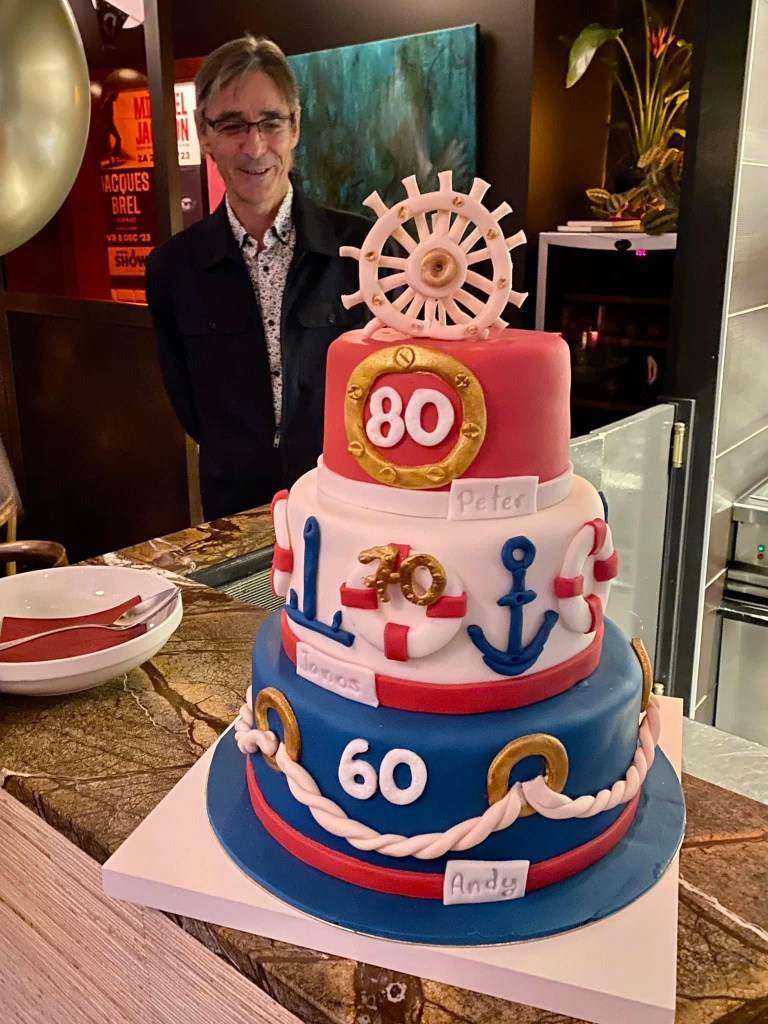 Celebrating Peters 80th birthday along with our barging friends Janos and Andy.