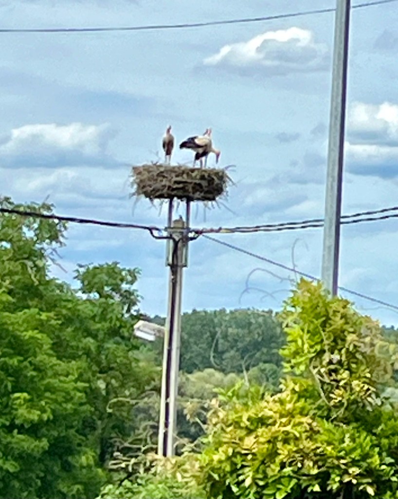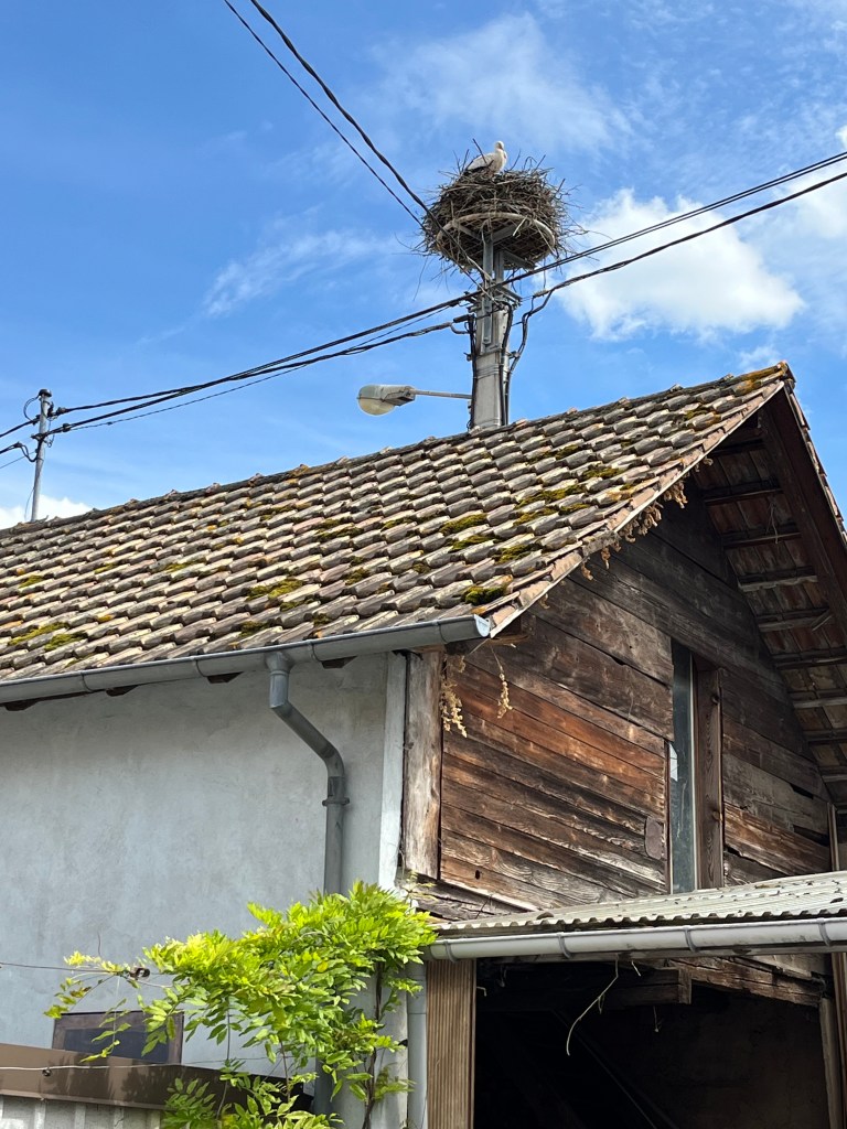 A symbol of Alsace is the white stork. On the way to Strasbourg we had noticed them forging in the swampy fields along the canal, but in coming to Waltersheim it was spot the stork nests that were either carefully balanced on roof tops or in specially constructed metal baskets.