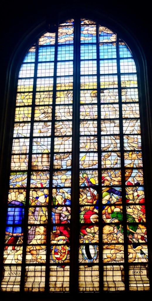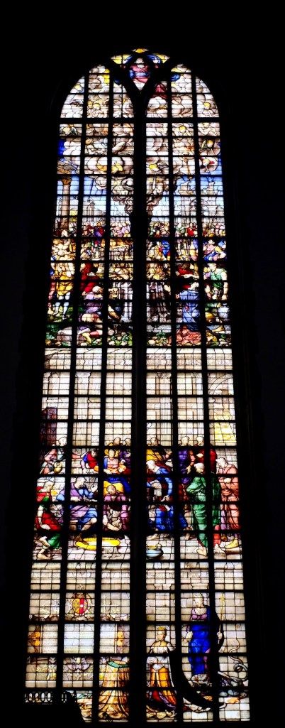 Built in 1563 and donated by Margaret of Parma, sister to Philip II of Spain this window is one of the 2 largest. The political message depicted in the top half is that flea religions must be combated. In the bottom half she depicts her dedication to serve the countries under her control, which included South Holland