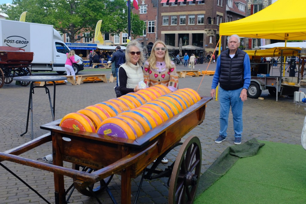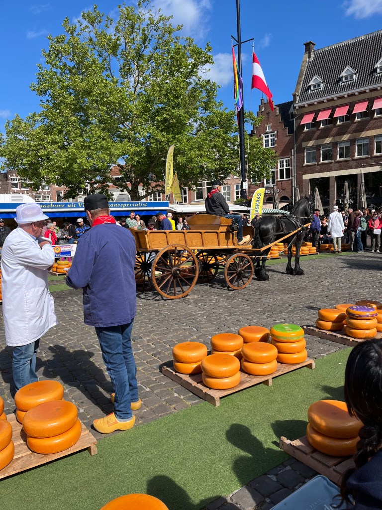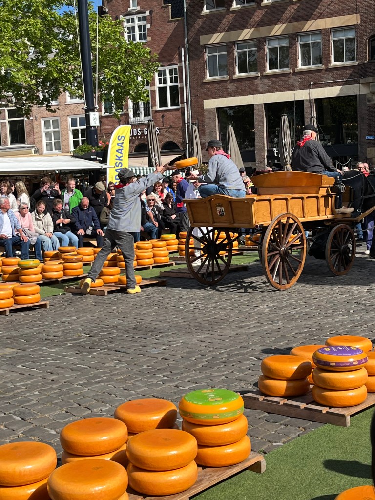 So it was farewell to Rotterdam and hello to Gouda. Yes that’s where the cheese comes from, but though we say Gouda, the Dutch say Oulder. In the Middle Ages cities obtained certain feudal rights that gave them a monopoly on certain goods. Gouda acquired the market rights to cheese. The farmers would take their cheeses to the market square, where they were traded by a ritual bargaining system called handjeklap in which buyers and sellers clap each others hands shouting out various prices. Once a price was agreed the cheese would be taken to the weighing house to complete the sale