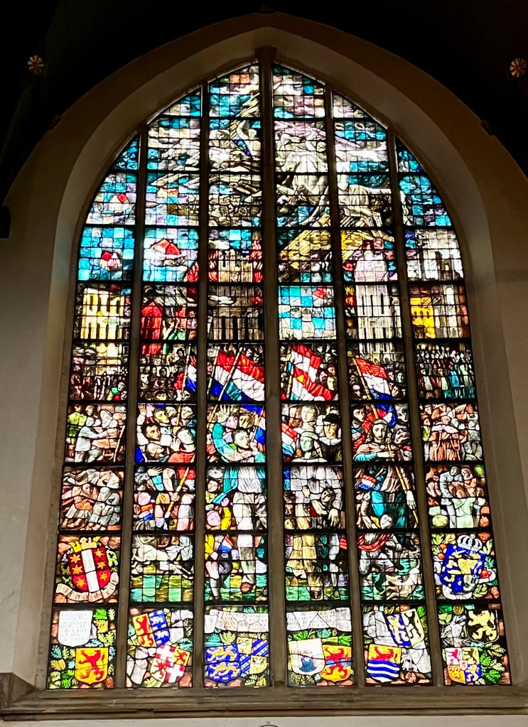 Fire destroy most of the church in 1552. The council decided to renovate the church and commissioned new windows. But like many ambitions projects, they ran out of money. Instead of giving up they appealed to the elite of the time to contribute to the restoration. Even cities in Southern Holland made a donation. With the rise of the Protestant Reformation and the break with the Catholic Church the existing windows were at risk. of being destroyed by ardent Protestants. The council removed the statues and icons from the church and installed militia to guard the completed windows. The subject matter of the windows built after the Reformation changed from biblical stories to messages on mercy and forgiveness as well as current events. During WW2 the windows were again at risk, so they were removed, boxed and stored until they could be safely replaced.